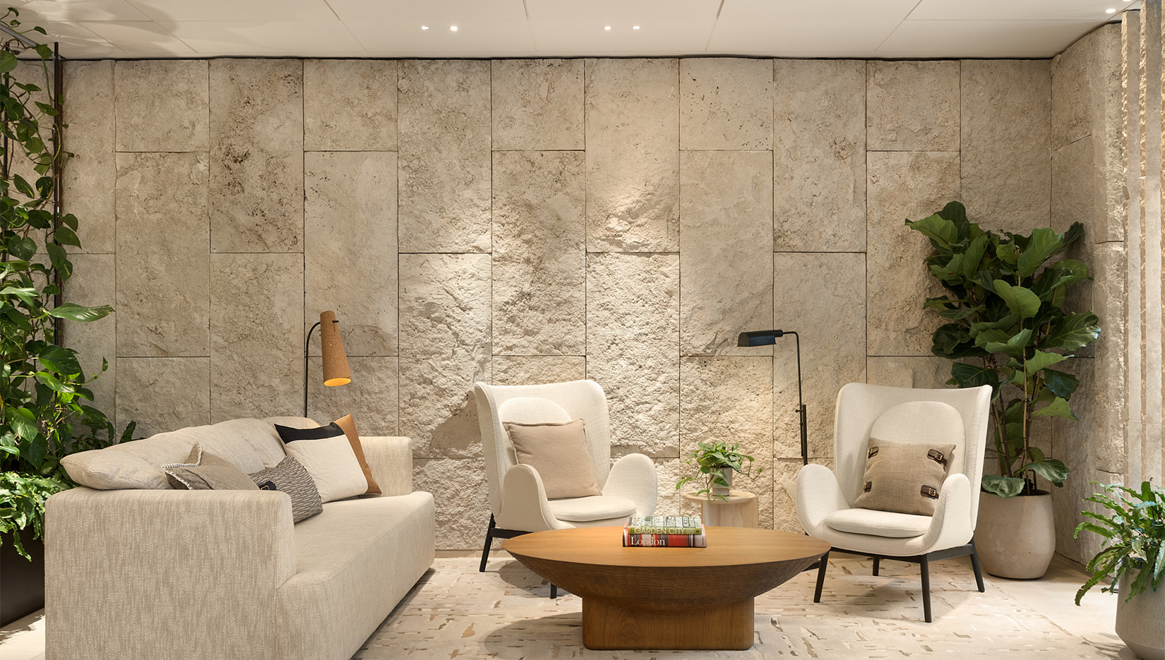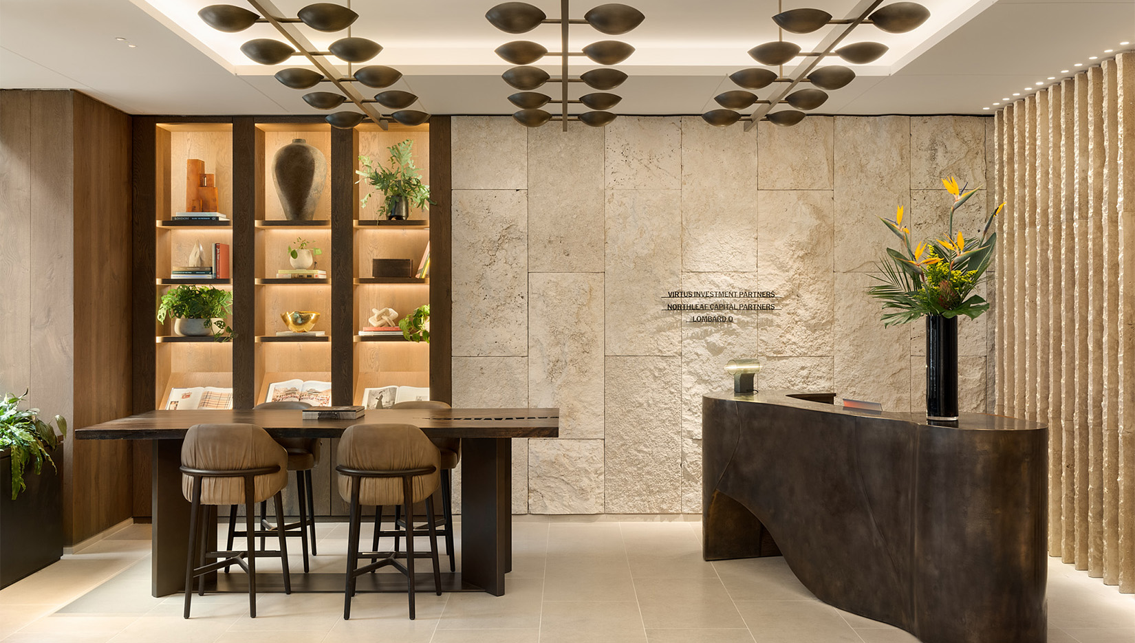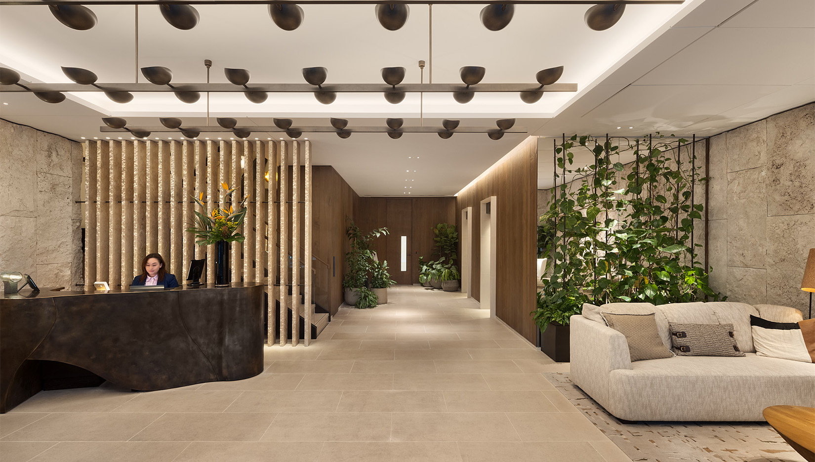 As part of the reception, we replaced the existing entrance with a new façade and entrance portal and installed a new bespoke timber and metal reception desk. Bespoke joinery was installed, along with a new balustrade to the existing staircase, the lifts were also completely refurbished. The new reception is notable for its use of stone, with new stone flooring and striking natural stone finish to the walls. Overall, the works to the reception updated the tired existing reception to a high-end, luxurious space, befitting the building and the area.